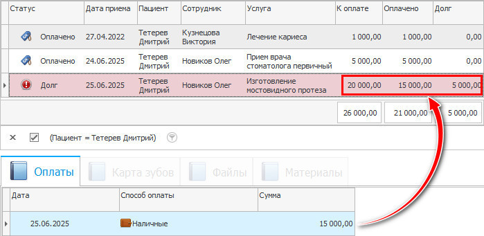 4. Важным этапом в этом всем является финансовая составляющая. Длительные процедуры и работы чаще всего предполагают значительные затраты и некоторые клиники предоставляют своим пациентам внутренние рассрочки. Это все можно, конечно же, так учитывать в нашей СРМ. Она покажет количество оплат, сумму долга, что значительно упрощает работу кассира и бухгалтера.